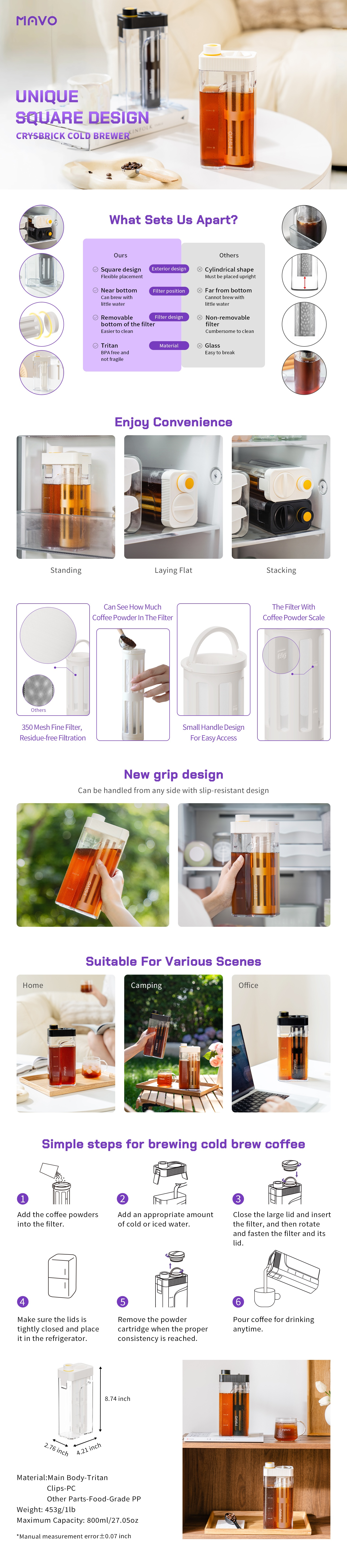 - Innovative Square Design - The cold brew coffee maker can be placed vertically, horizontally or even stacked in the refrigerator. It allows you to make full use of the space in the refrigerator. The whole pot is sealed and watertight to ensure the pure taste of coffee
