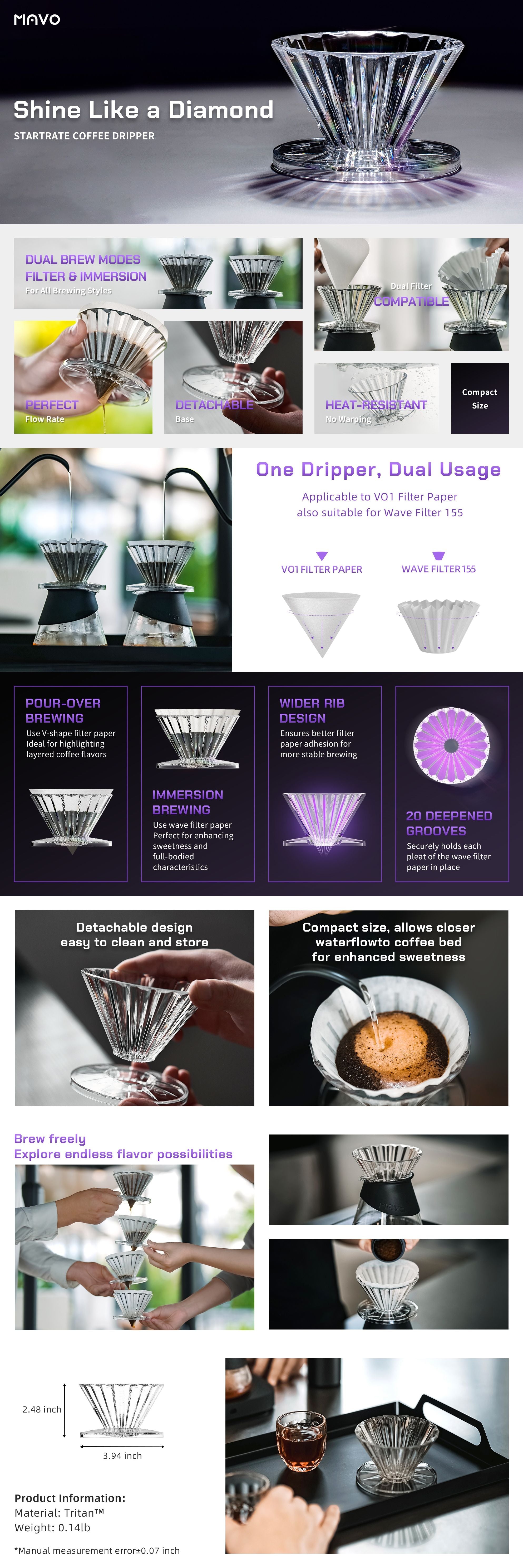 - Universal Compatibility: Fits most mugs and servers (1-2 cups). Works seamlessly with standard V01 paper filter and wave filter 155 (not included) for two brewing methods. Detachable design for easy cleanup and residue-free brewing